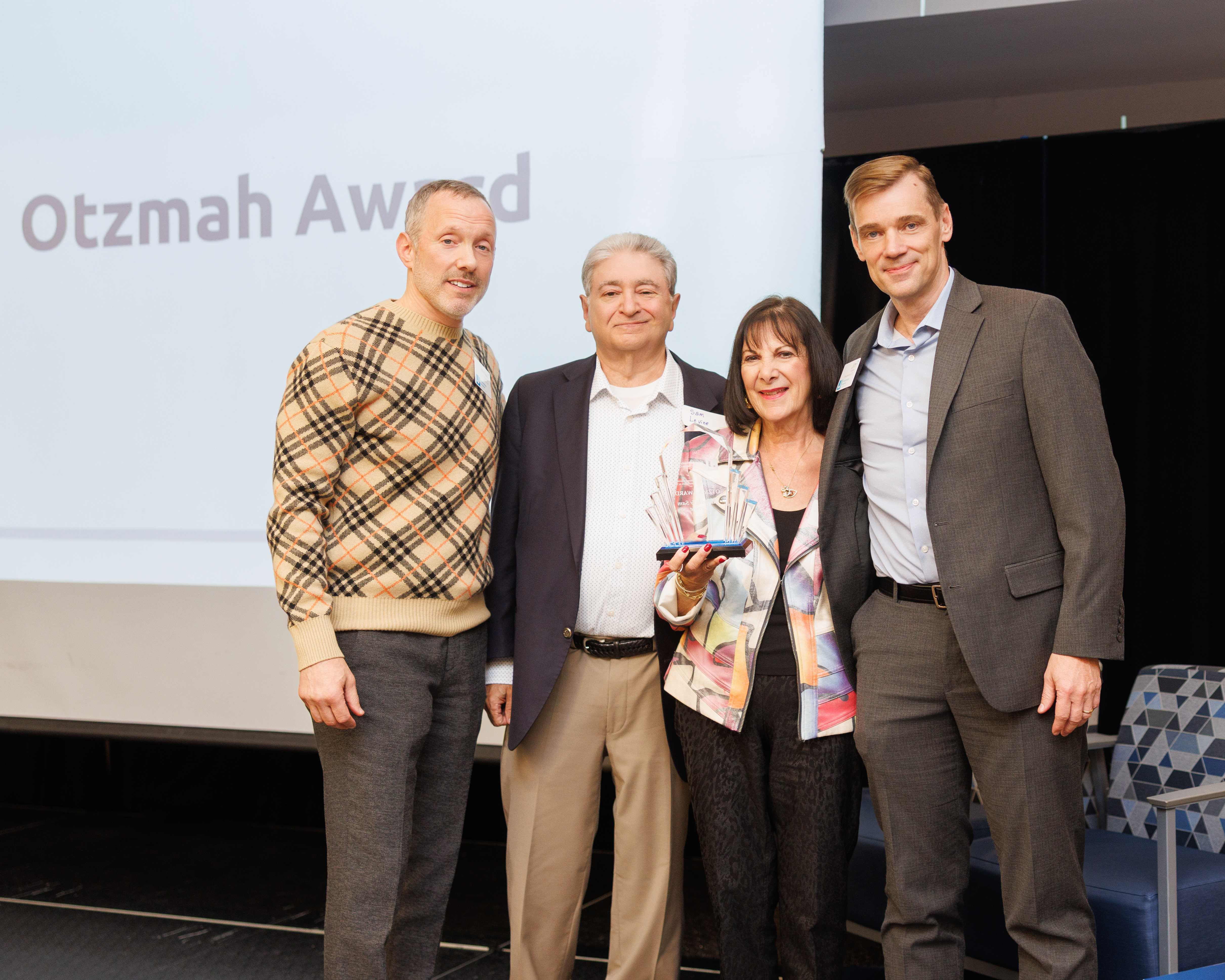 Pictured are outgoing J Board Chair Michael Novicoff, Otzmah Award winners Sam and Danielle Levine and CEO Jim Sluyter at The J’s annual meeting.
