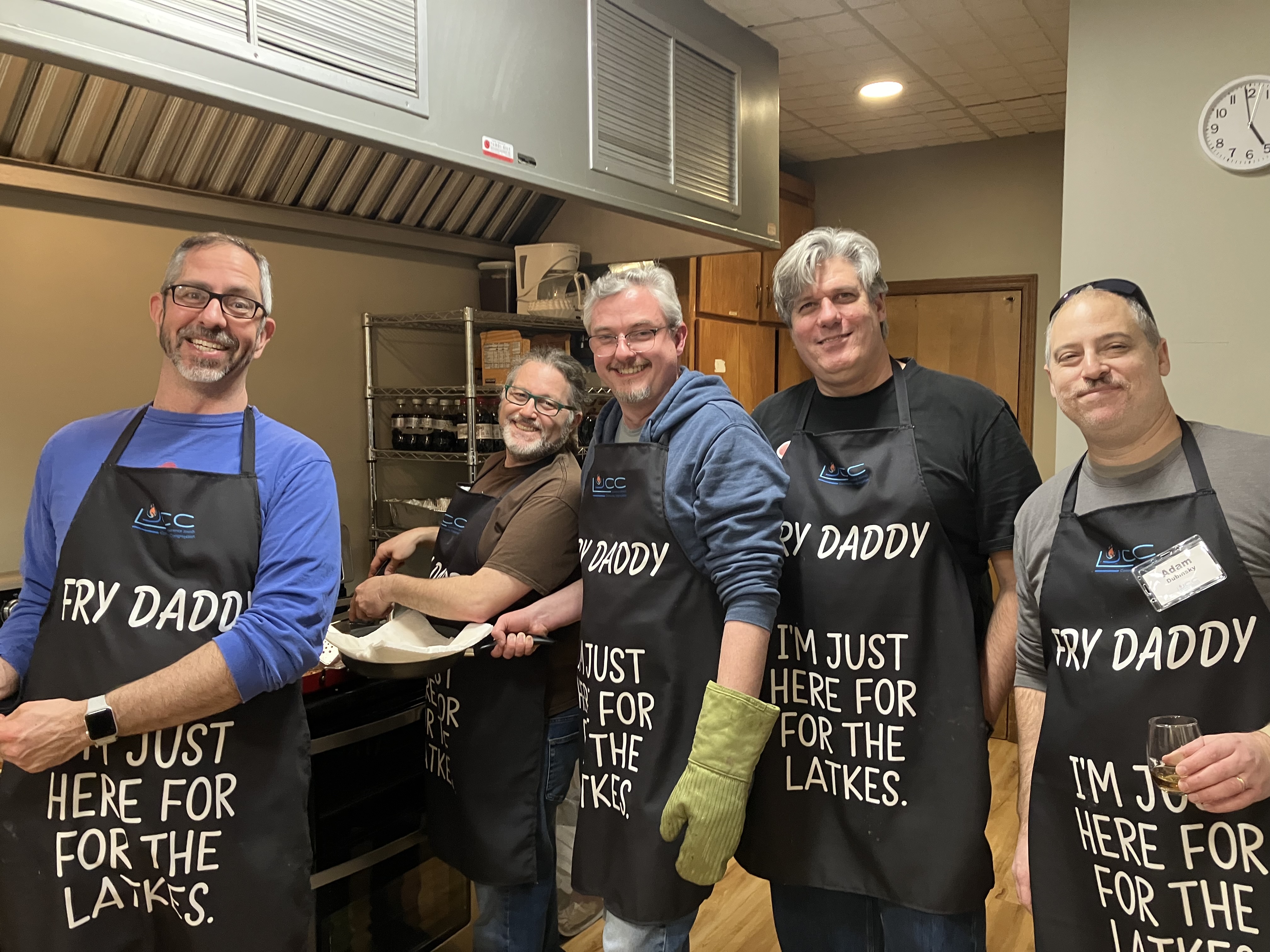 The “Fry Daddies” preparing latkes for the LJCC’s Hanukkah party last year. Pictured (from left) are Howard Lubliner, Greg Rudnick, Russell Swinburne-Romine, Michael Hennecke and Adam Dubinsky.