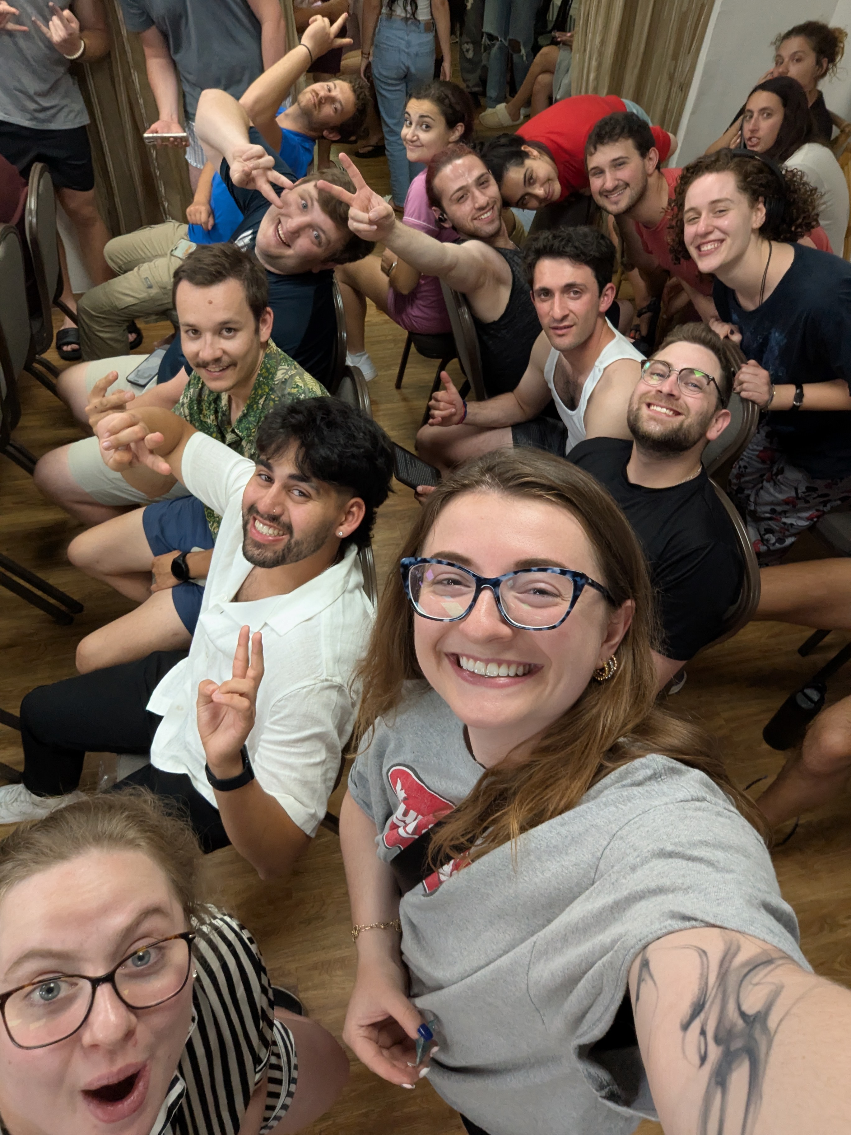 Alexa Summers (holding the camera) and members of the Birthright group she was leading keeping their spirits up in a bomb shelter.