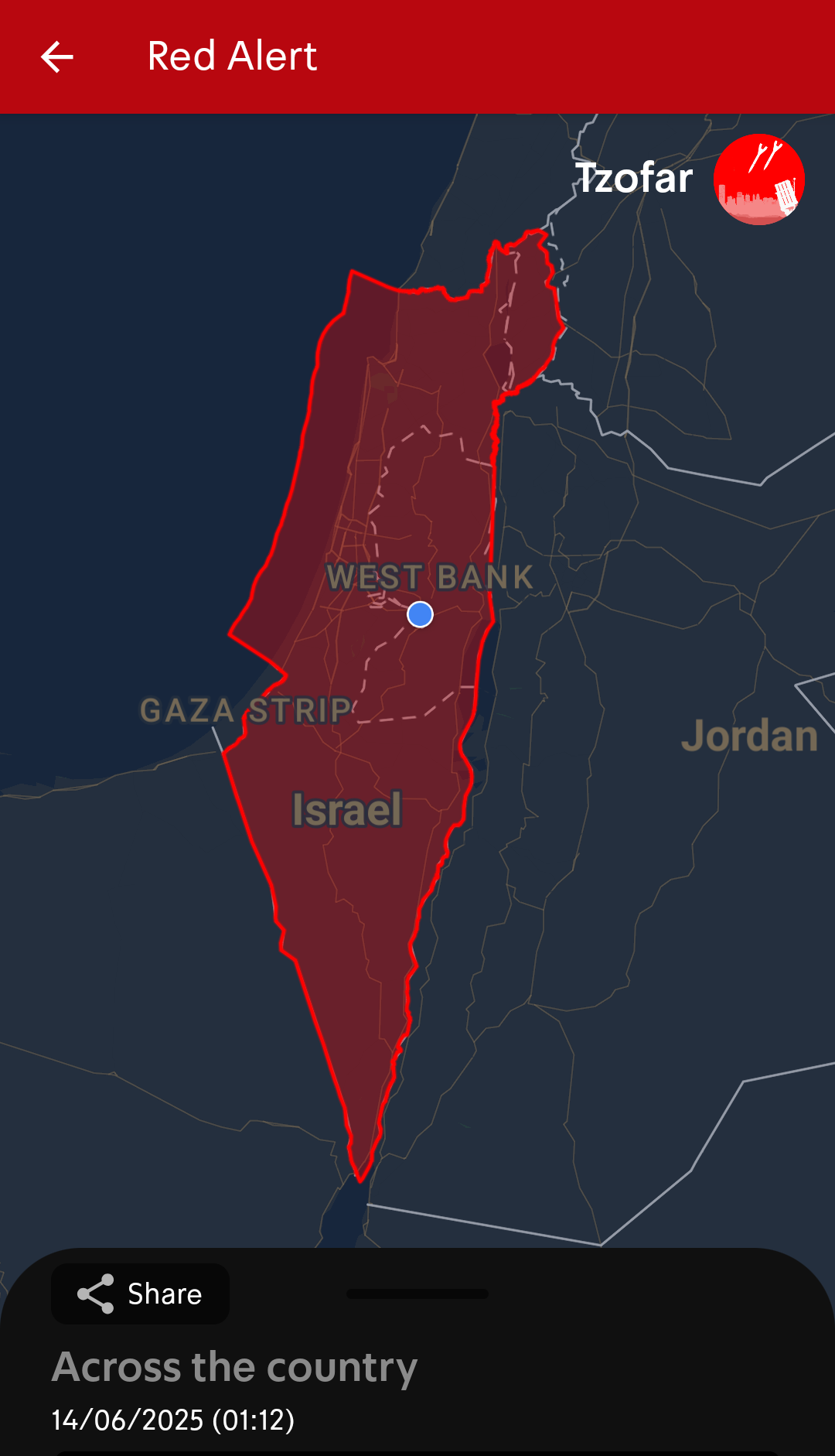 A screenshot of an Israeli missile attack warning app showing all of Israel under fire.