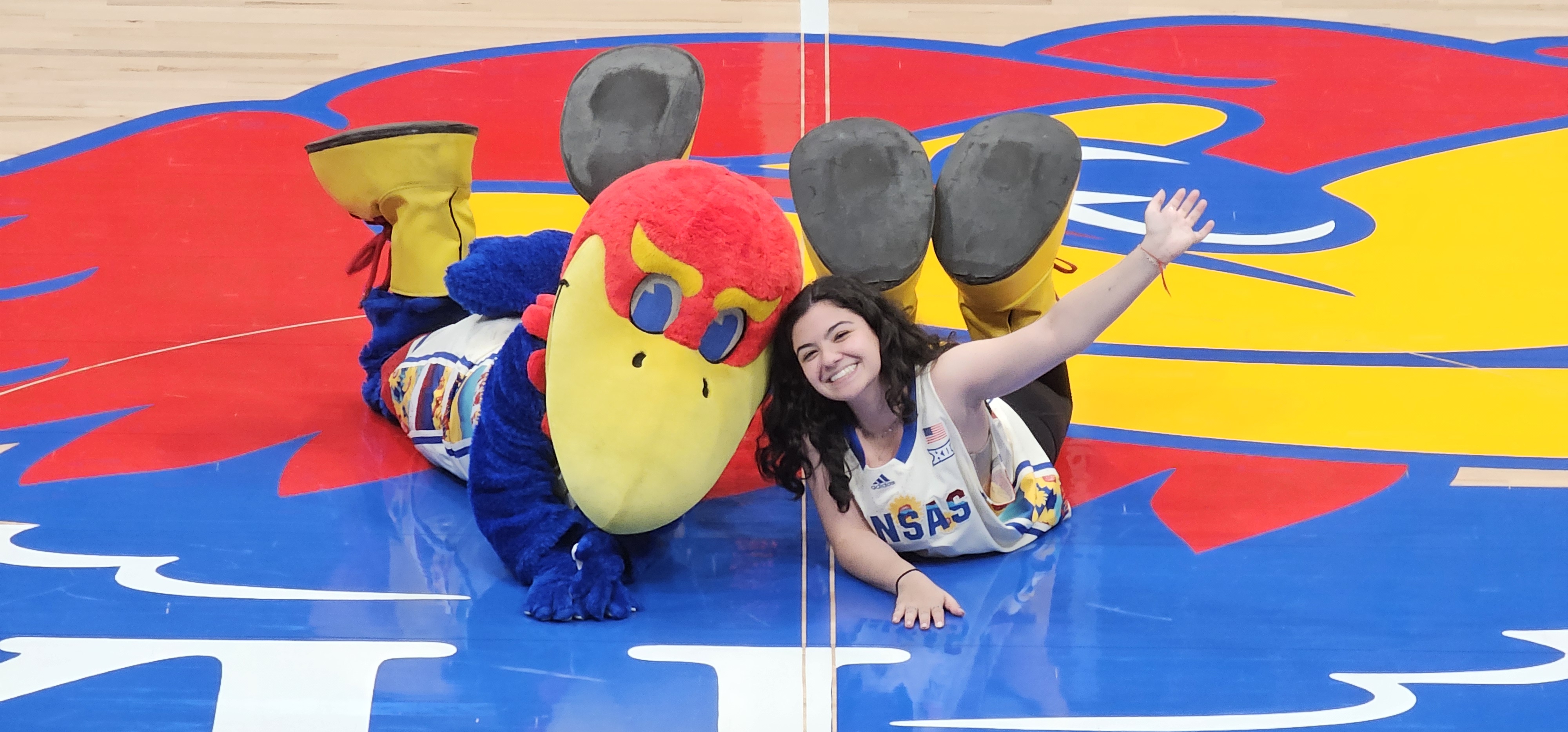 KU graduate Rachel Kricsfeld, one of the students who performed as KU mascot Baby Jay, with Baby Jay on the court at Allen Fieldhouse in Lawrence, Kansas.