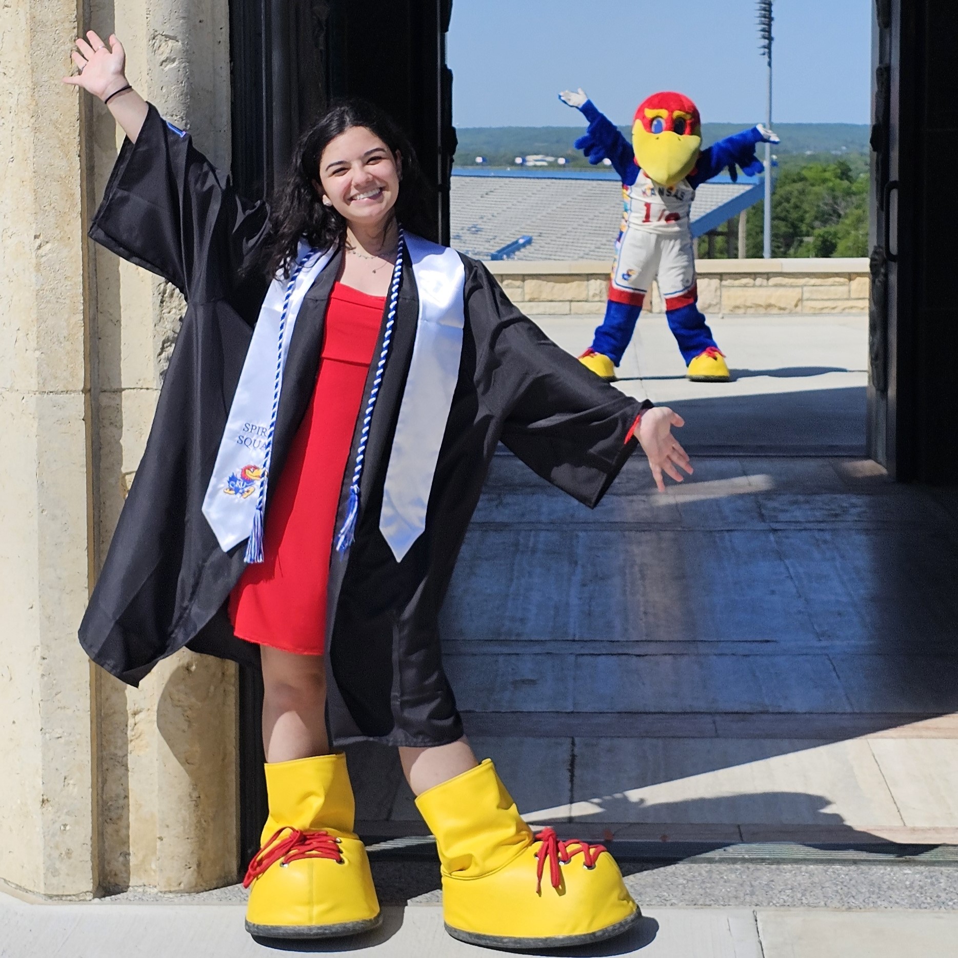 Being under 5 feet tall and starting school as a dance major made Kricsfeld perfect for the role of KU’s Baby Jay mascot, which she did her sophomore, junior and senior years of college. One of five members of the Baby Jay team, she committed to a practice and games schedule of approximately 10-12 hours per week, depending on the time of year.