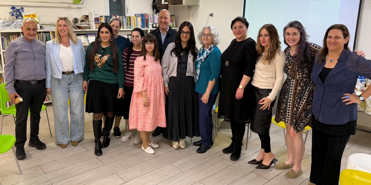 Pictured are ICEI staff, school staff and visitors: Tzion Moshe, Limor Gouliger-Hakim and five teachers, behind them Lee Perlman, Ellen Portnoy, principal Gila Aroussi, a teacher, Rivka Cohen and Amit Yaniv-Zehavi. (Ellen Portnoy)